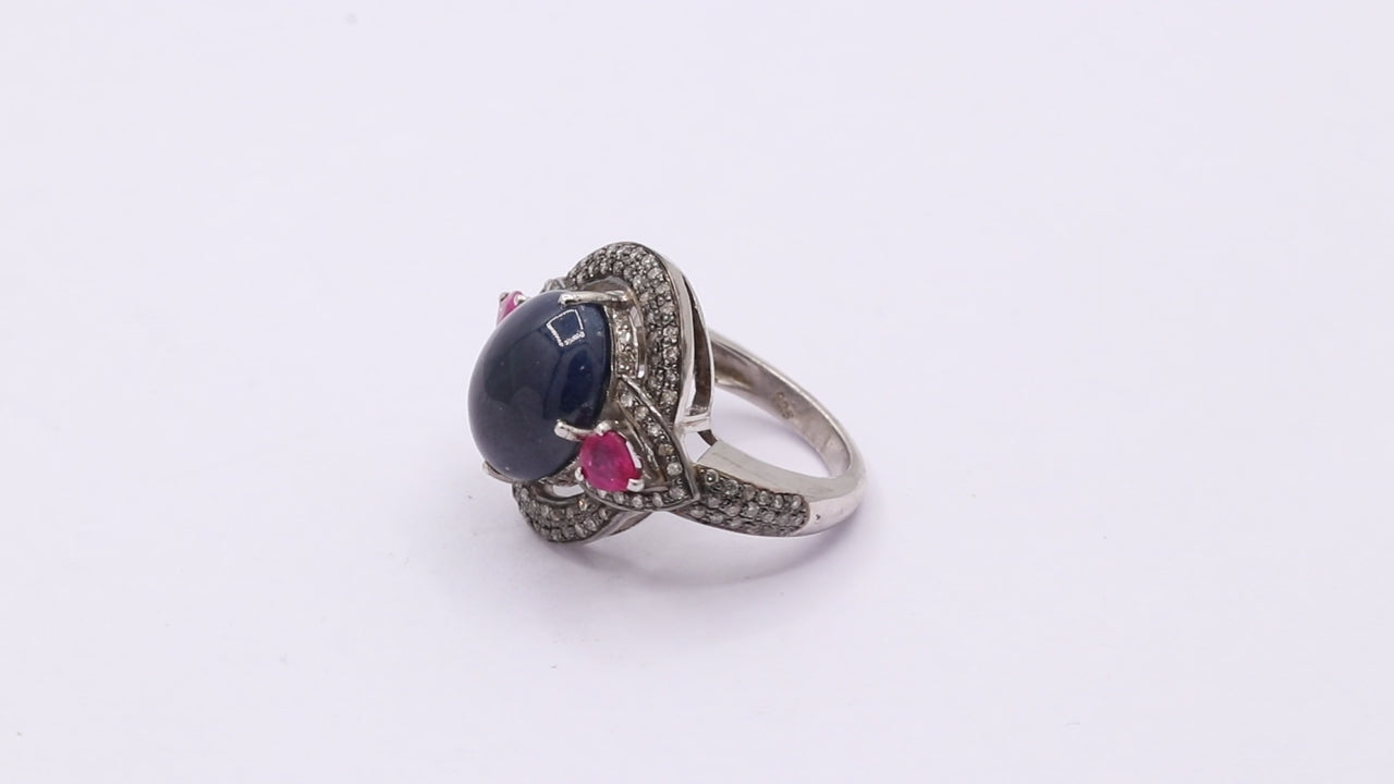 Natural Blue Sapphire, Ruby With Diamond 925 Silver Ring