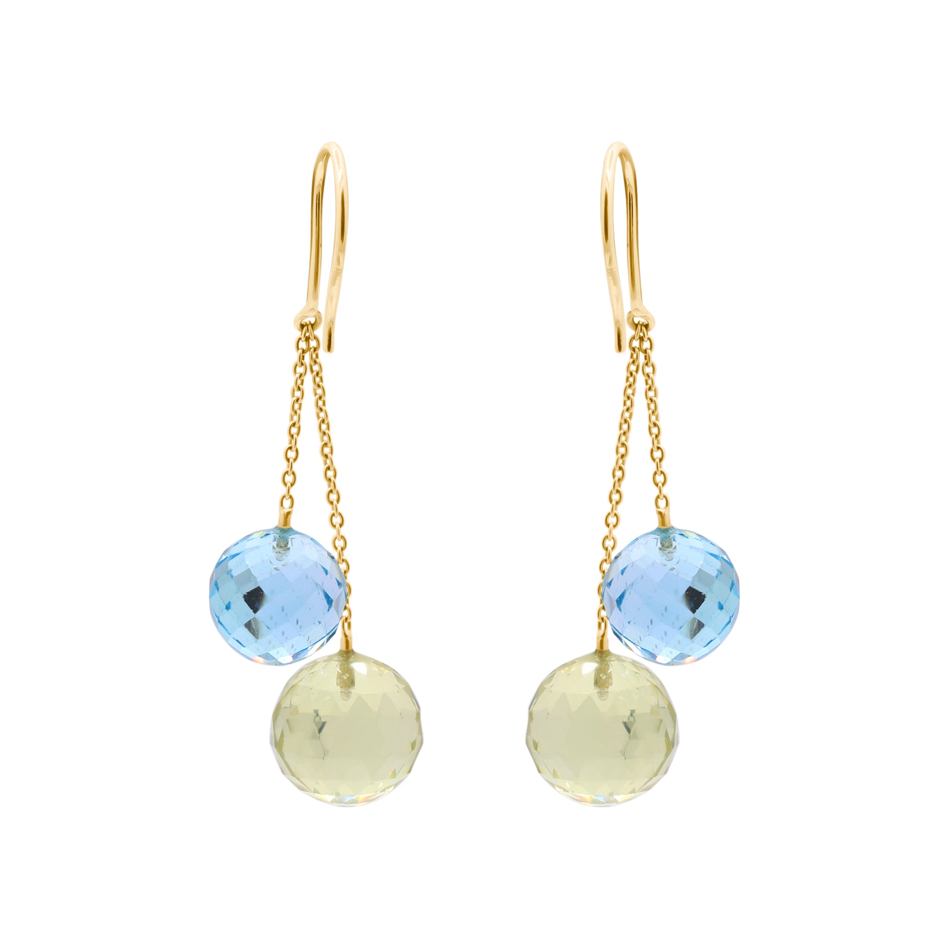 Natural Blue Topaz And Lemon Quartz Ball Shaped Gemstone Earring In 18k Yellow Gold