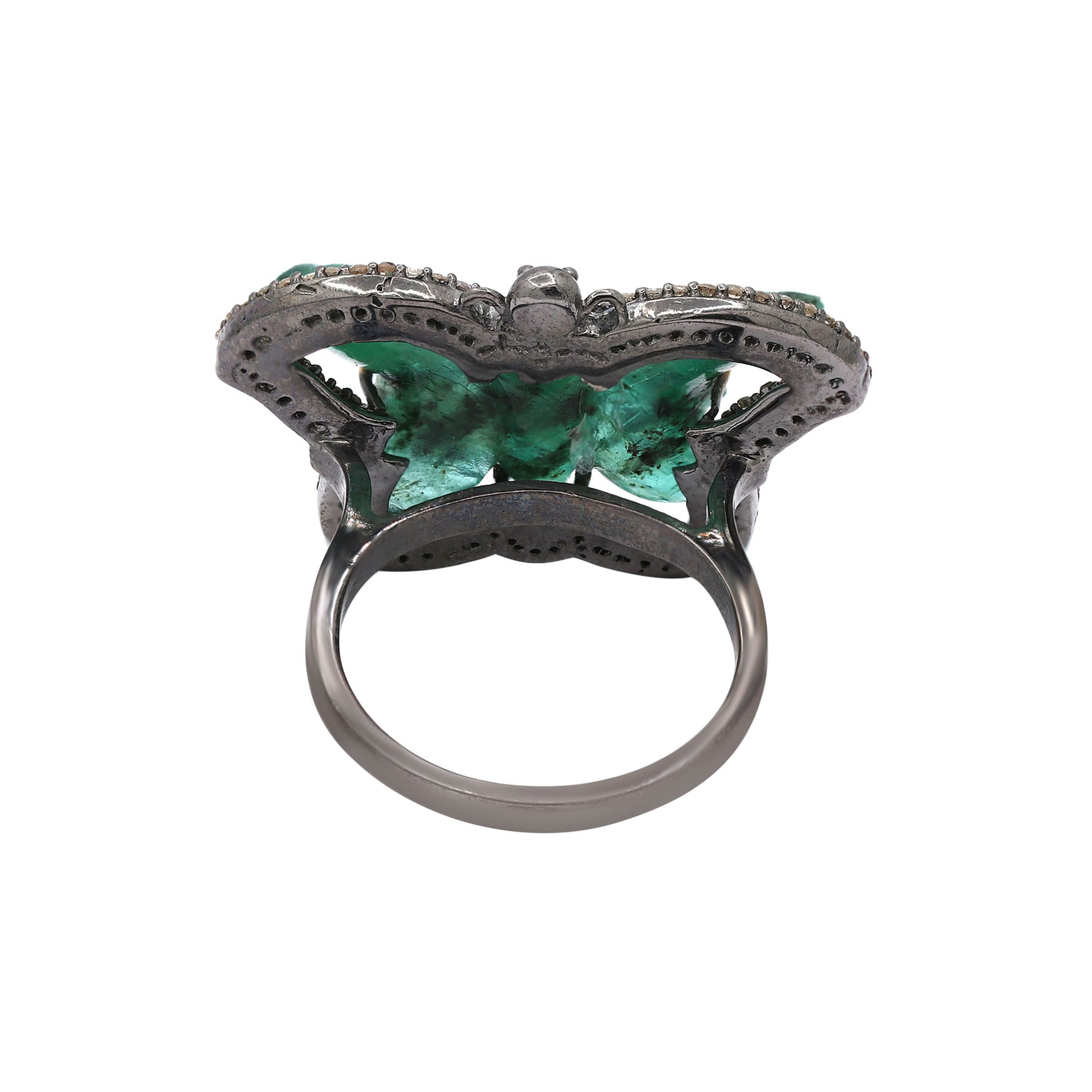 Butterfly Design 925 Sterling Silver Natural Carved Emerald With Diamond Ring