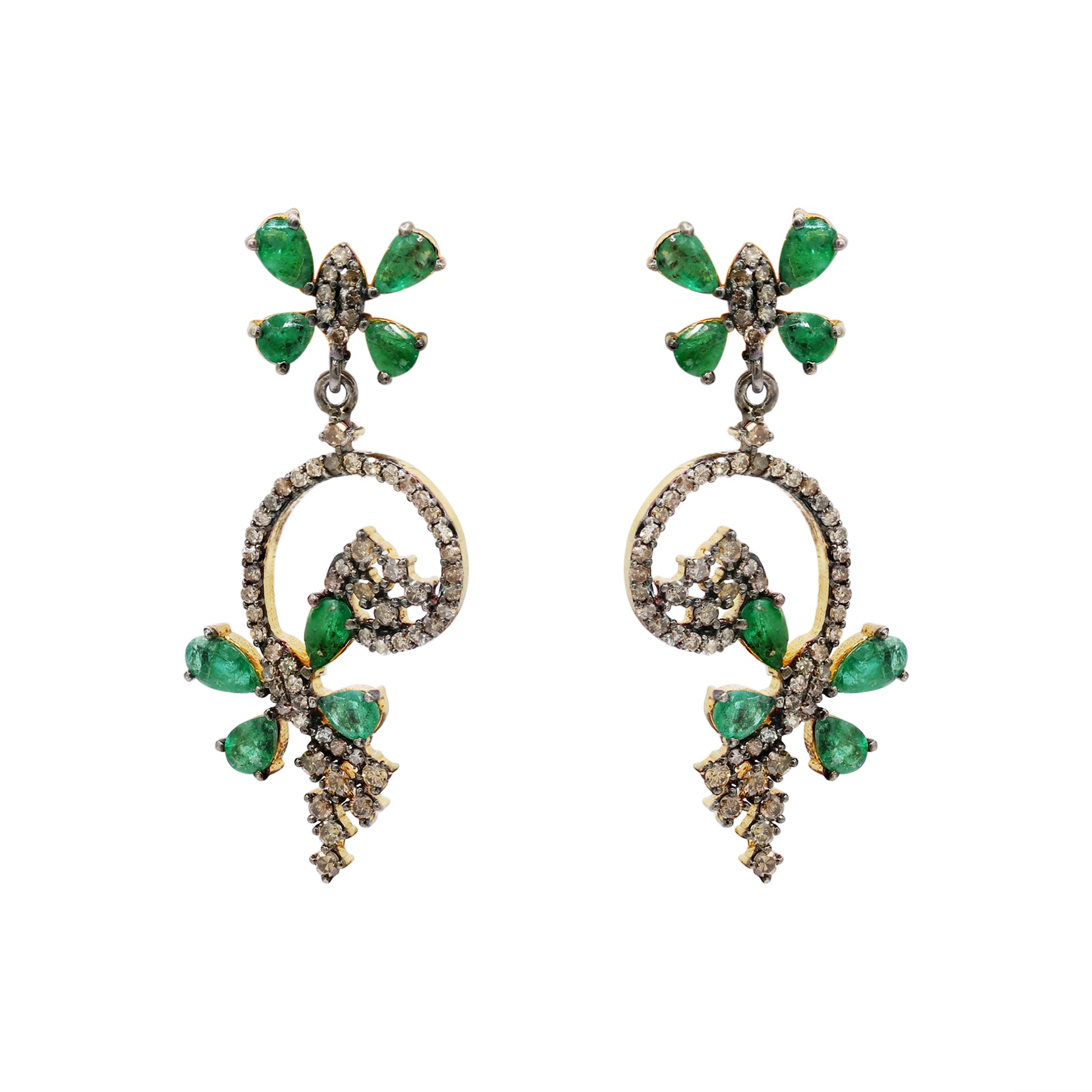Natural Emerald And Diamond 925 Sterling Silver Drop Earring