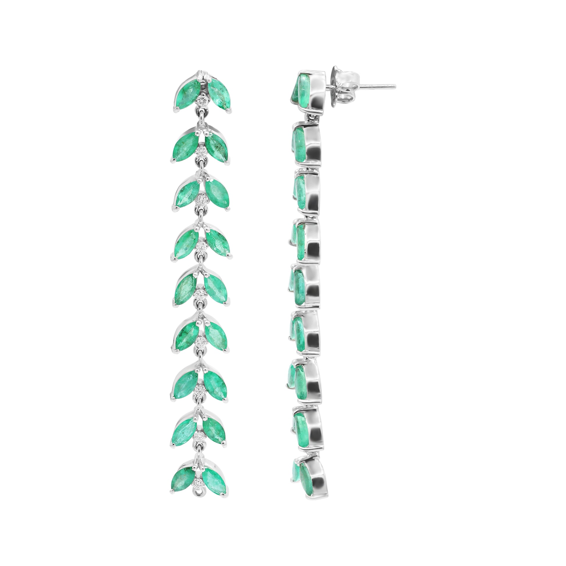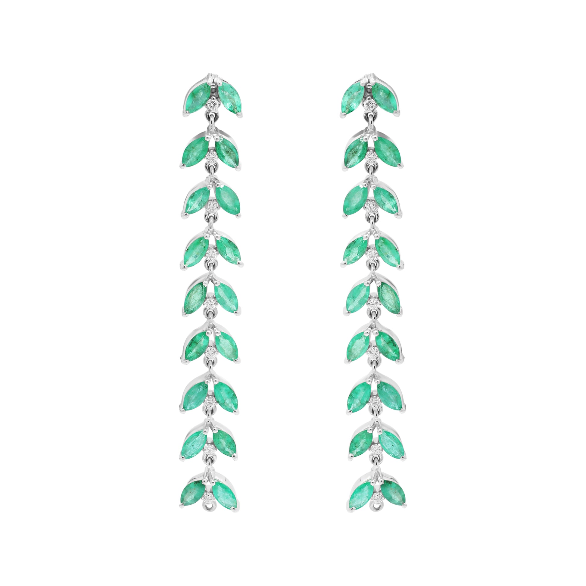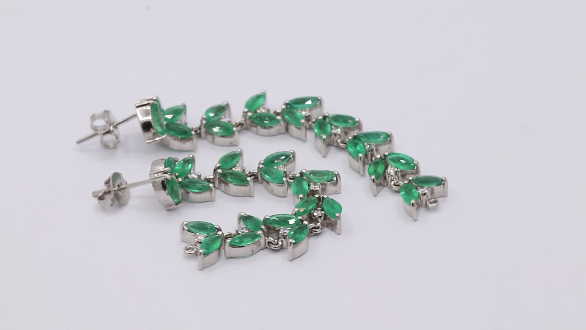 Leaf Shaped Natural Emerald With Diamond Drop Earrings In 18k White Gold