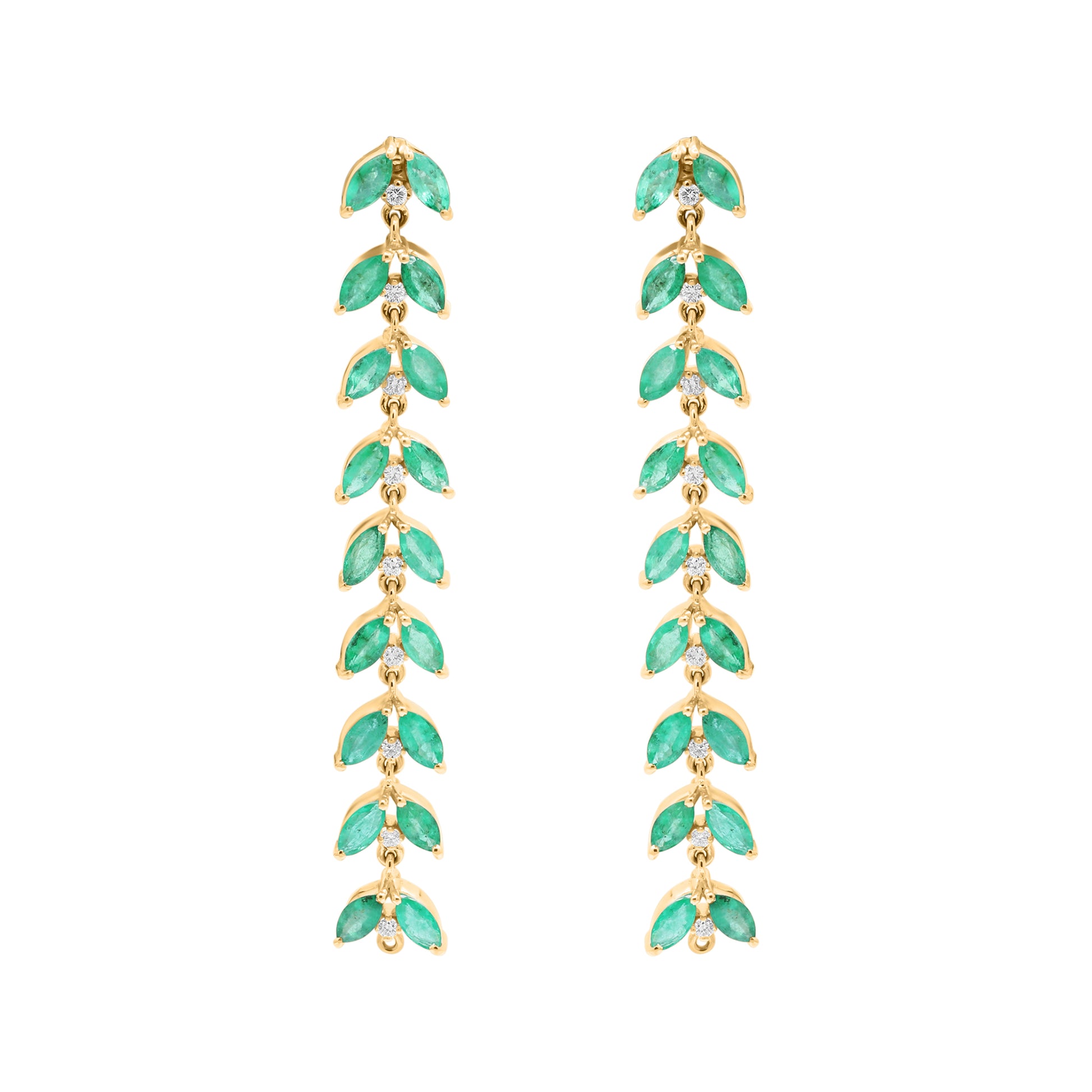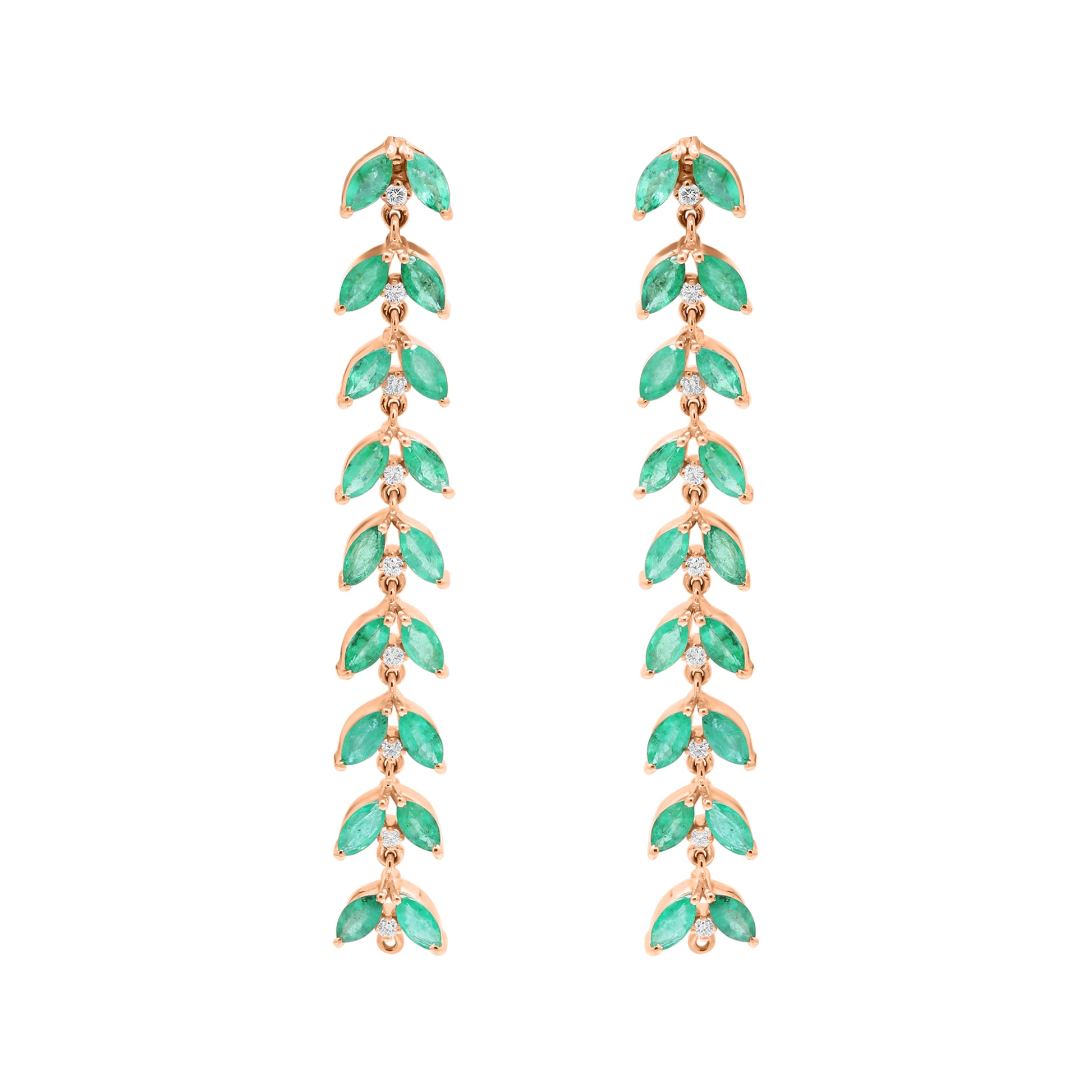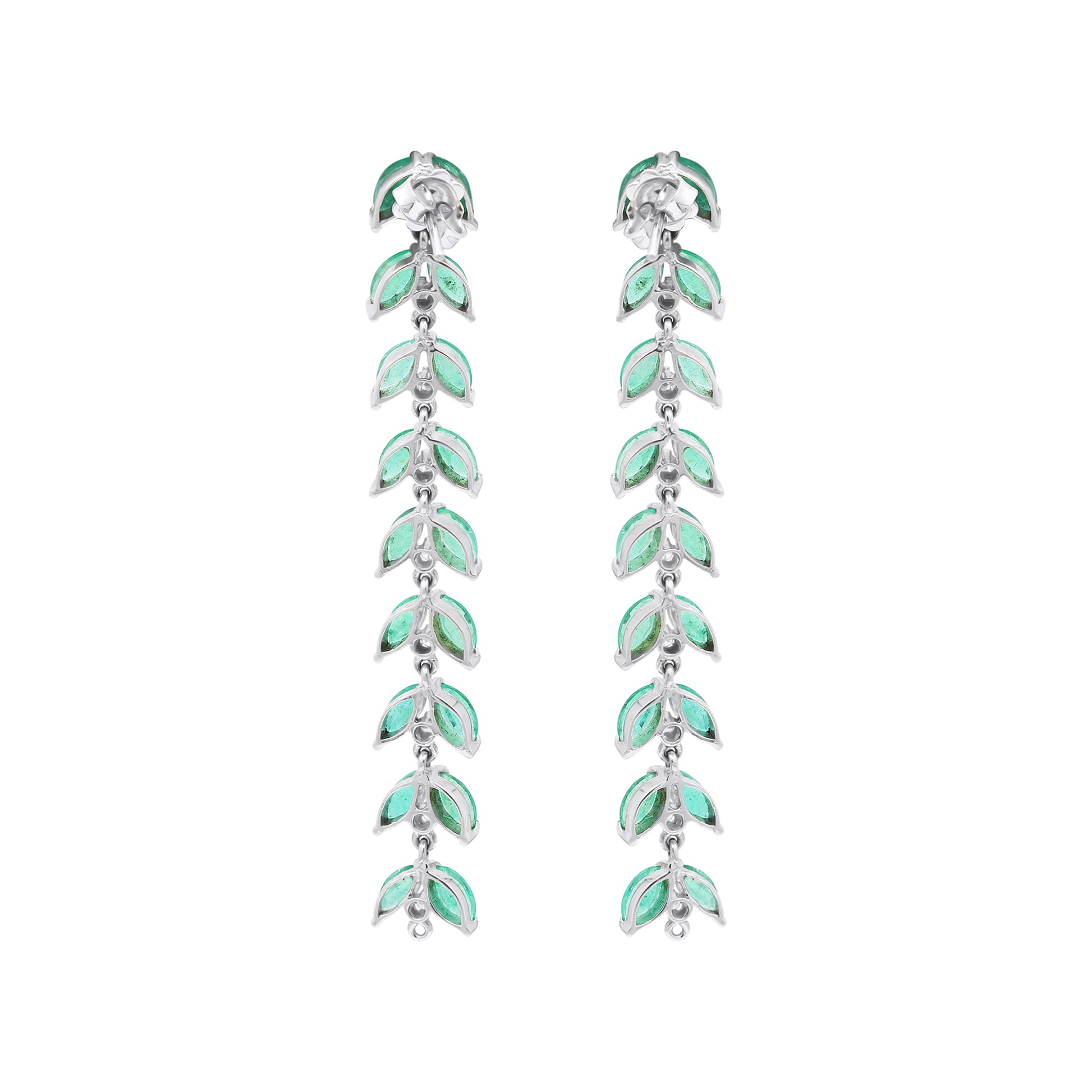 Leaf Shaped Natural Emerald With Diamond Drop Earrings In 18k White Gold