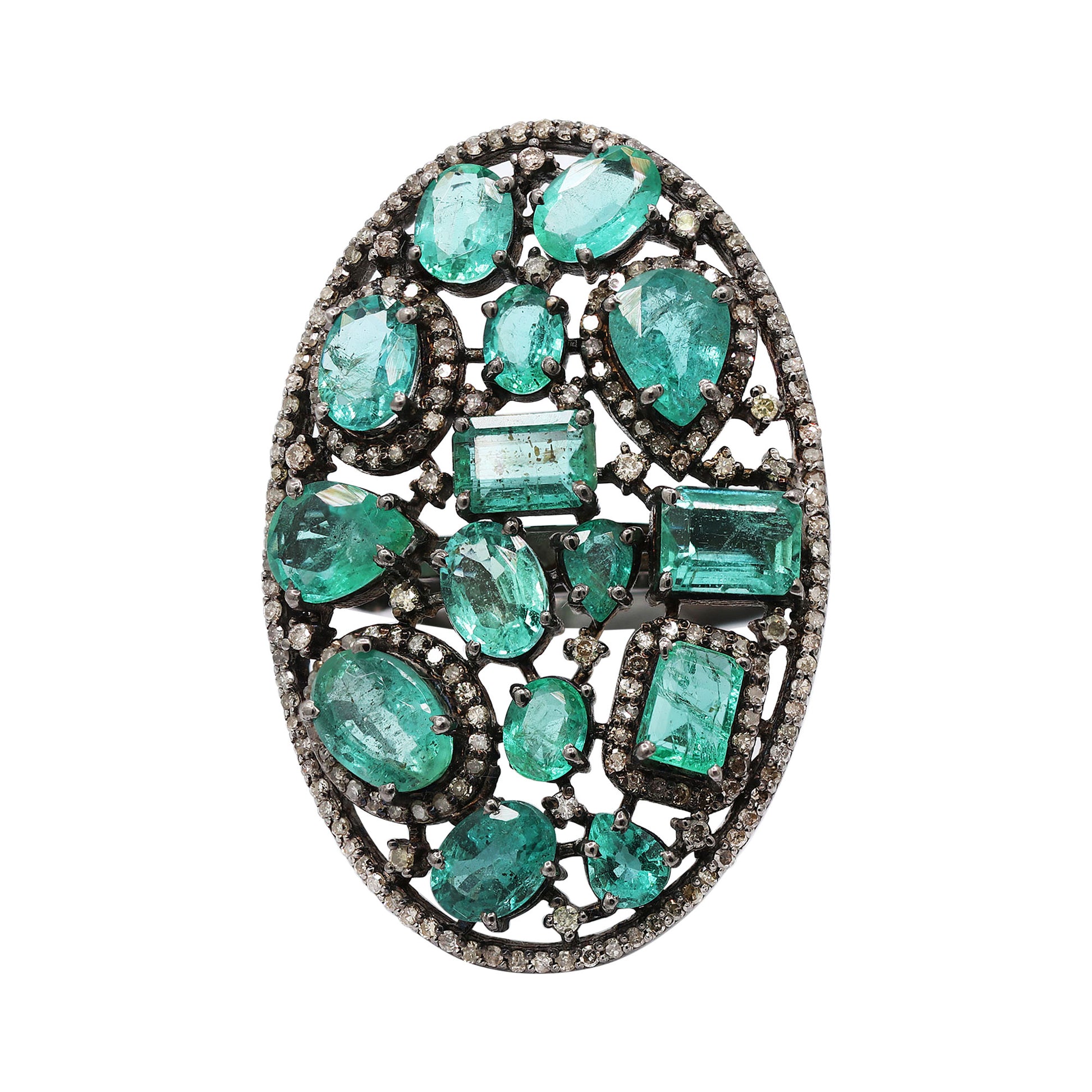 Natural Emerald And Diamond 925 Sterling Silver Black Rhodium Ring