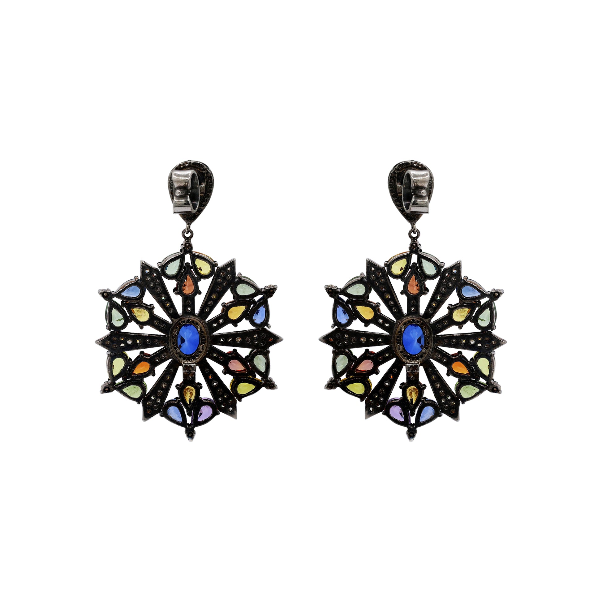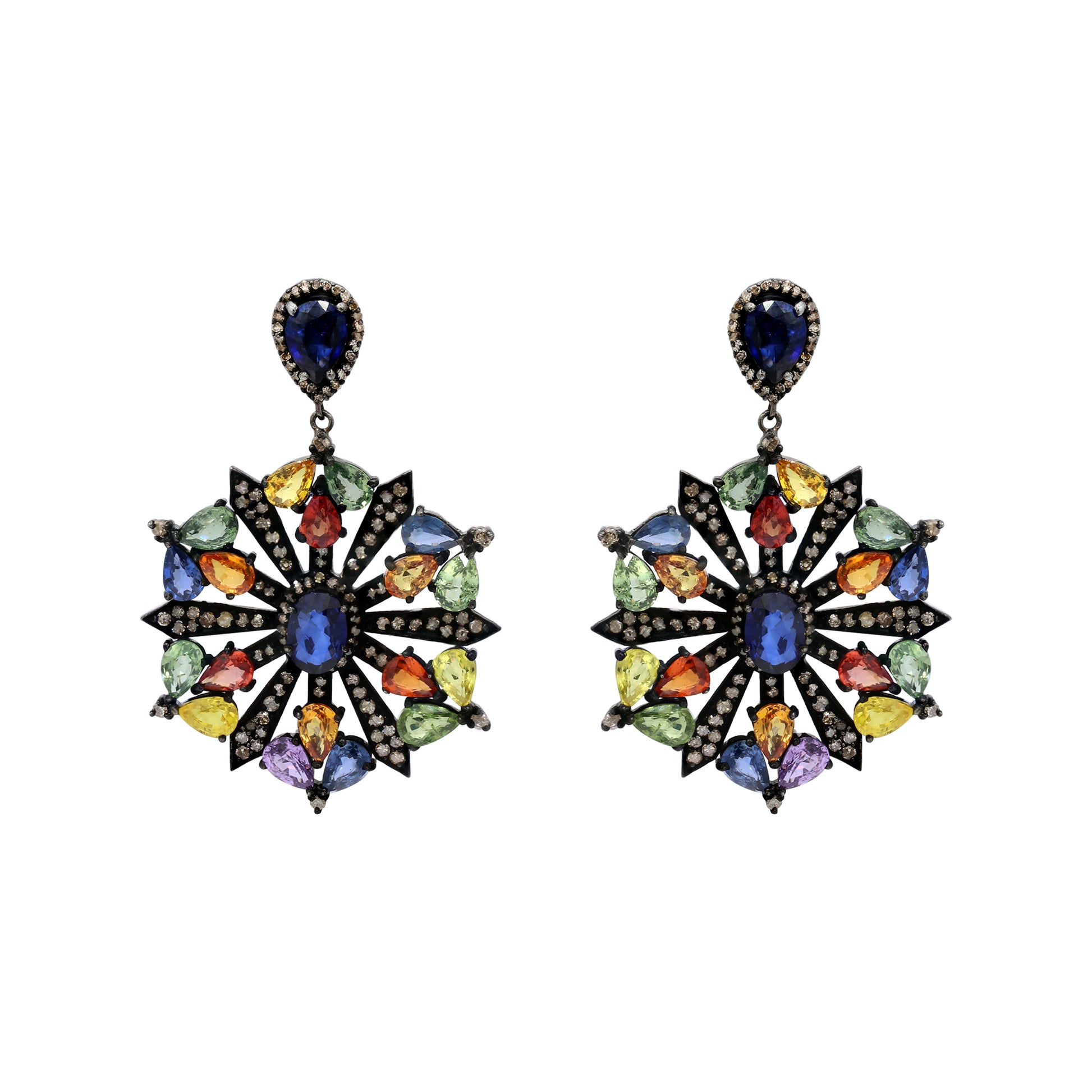 Multi Sapphire And Diamond 925 Sterling Silver Drop Earrings