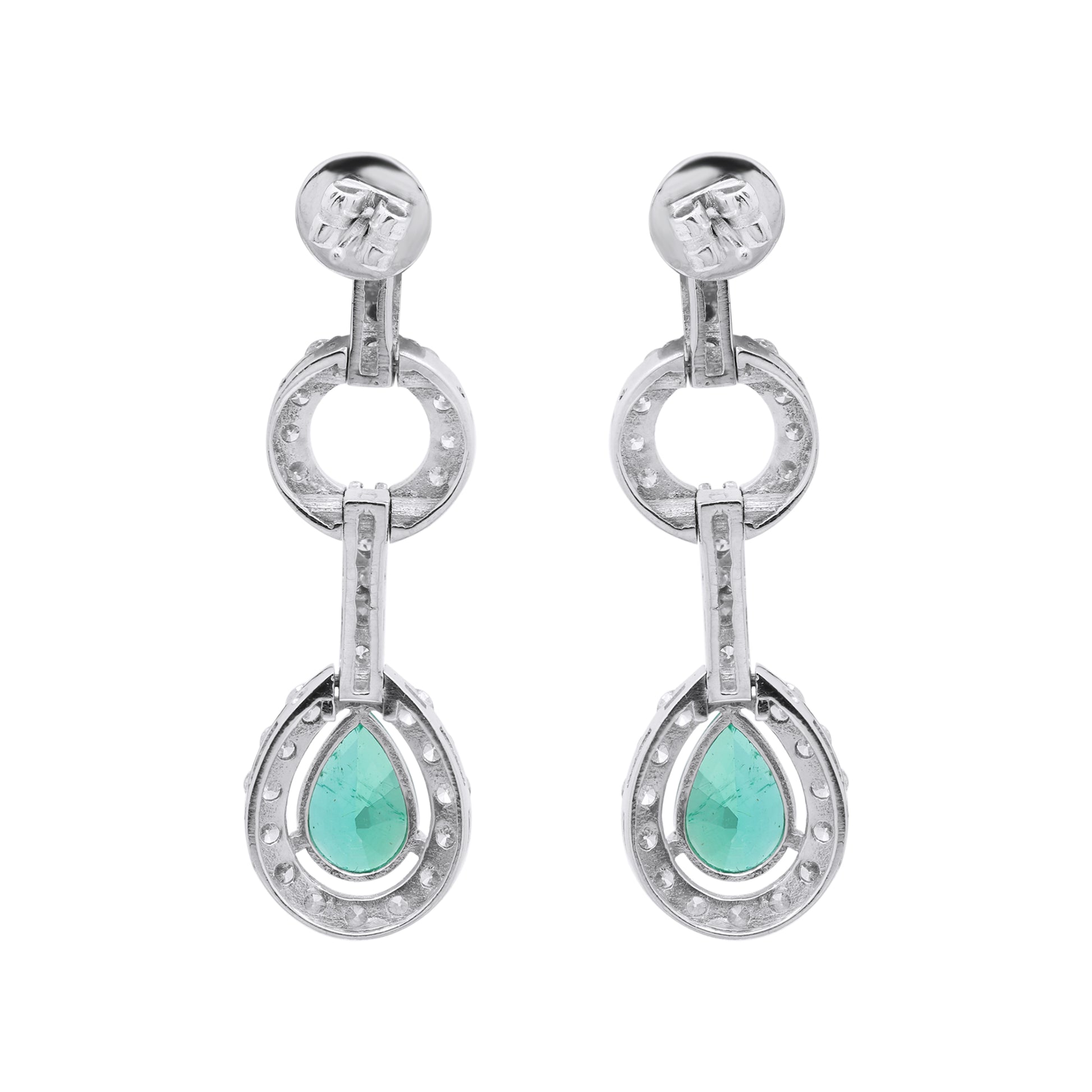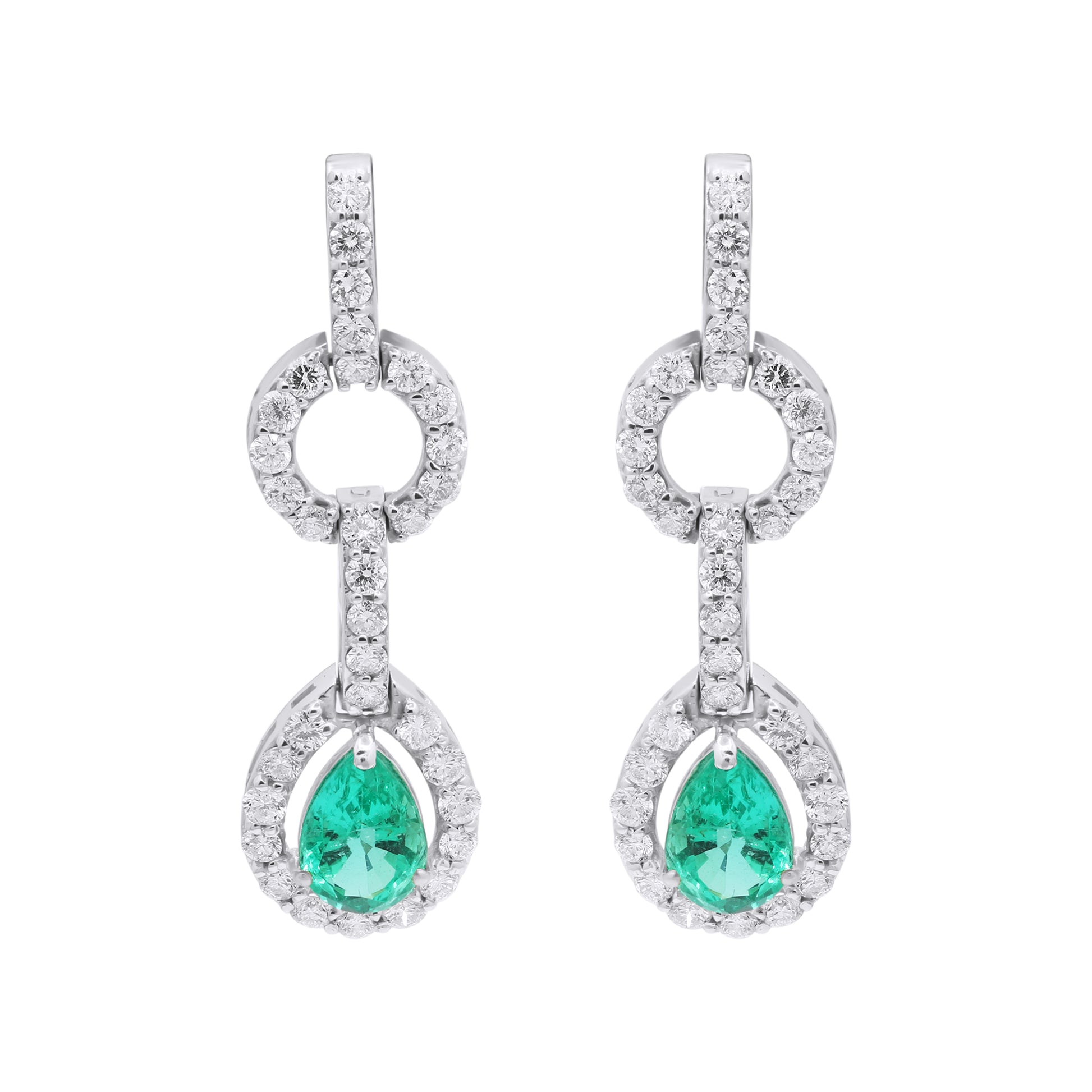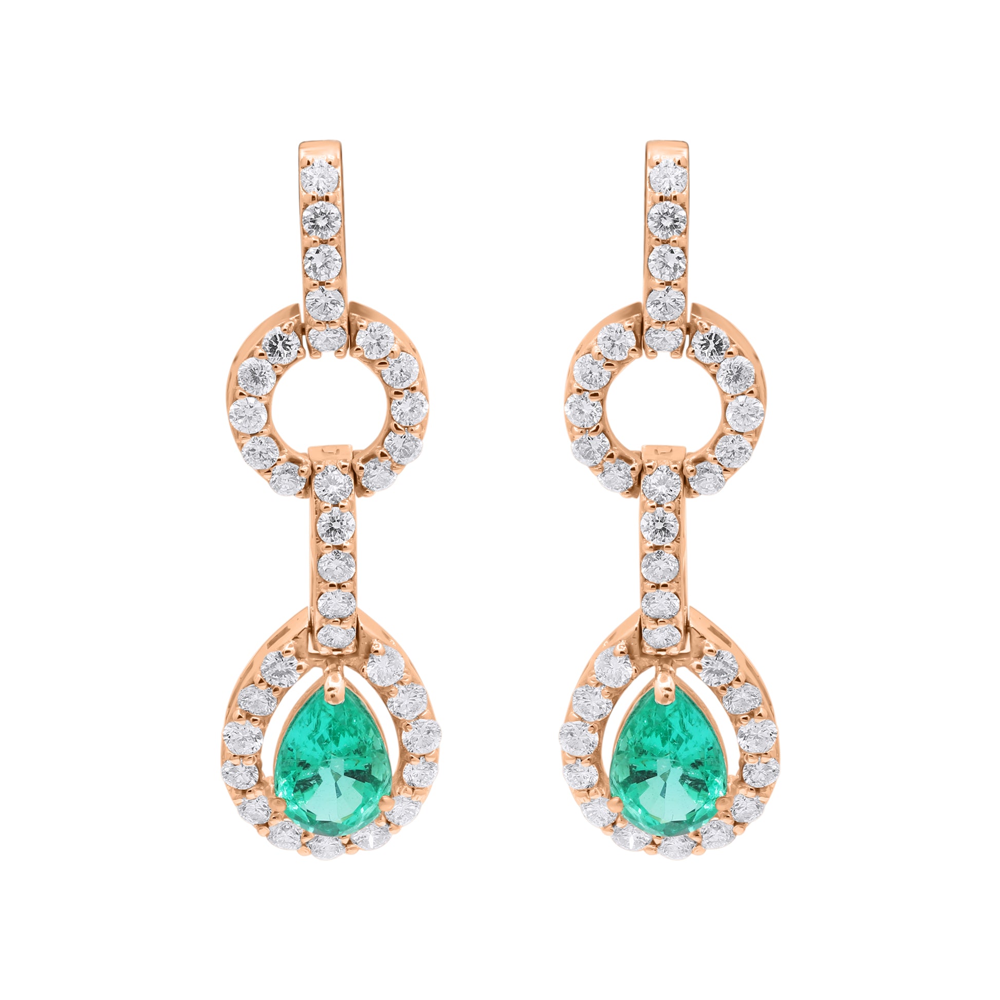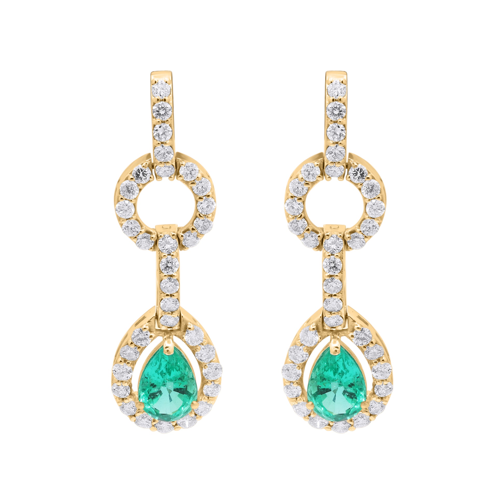 Pear Shaped Natural Emerald Gemstone With Diamond Dangle Earrings In 18k Yellow Gold