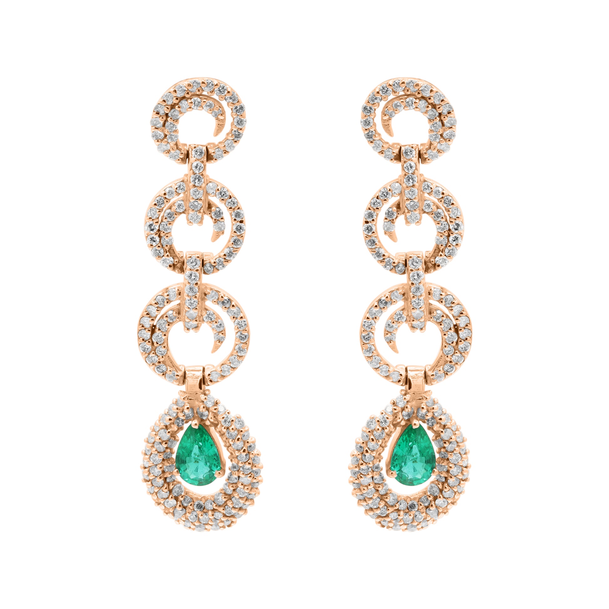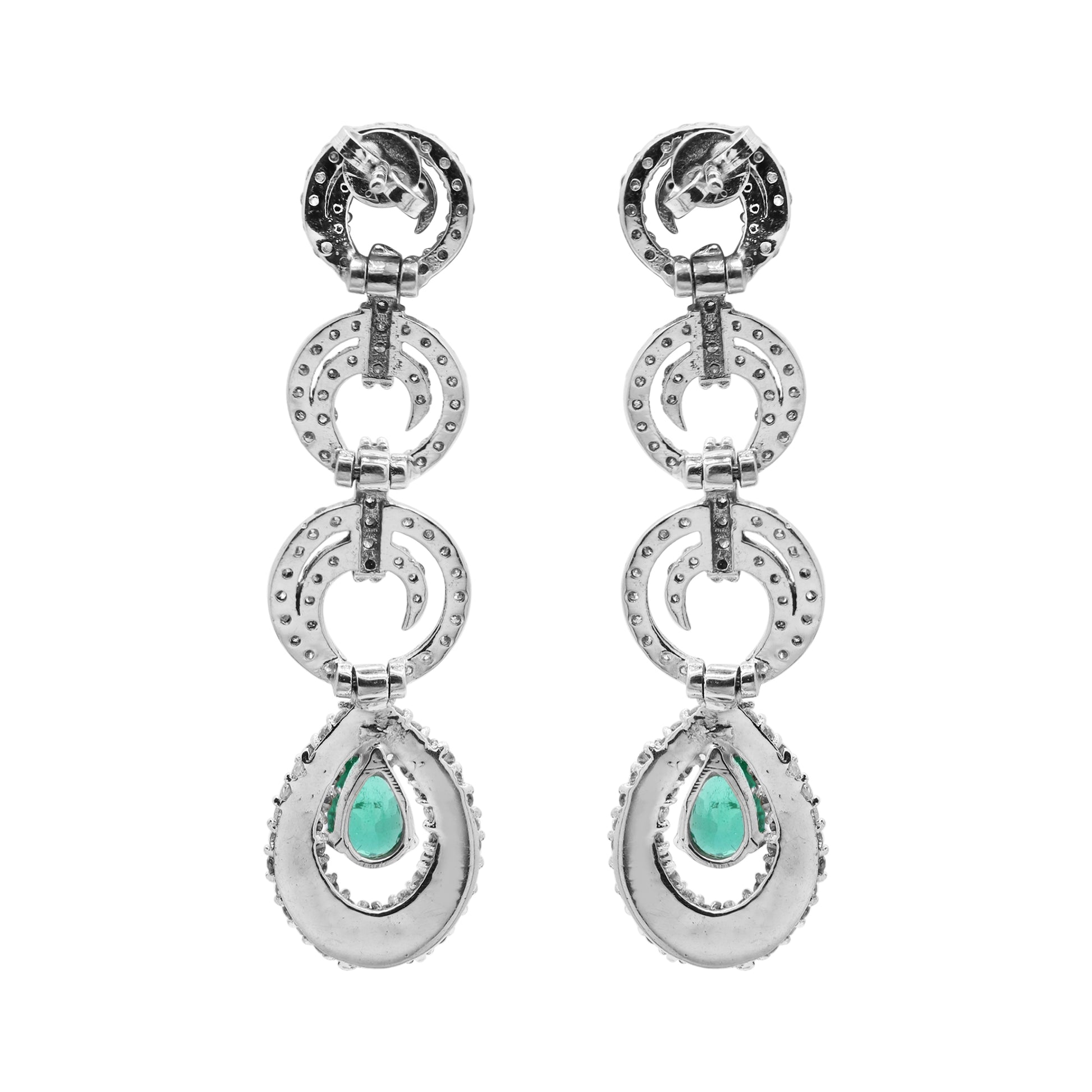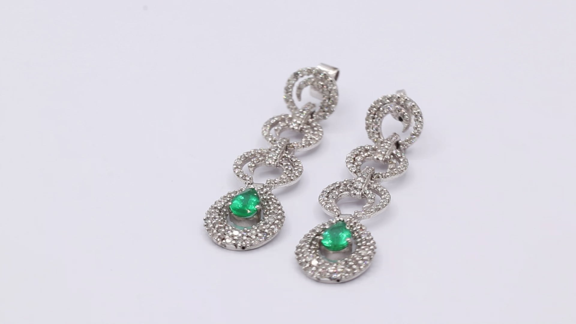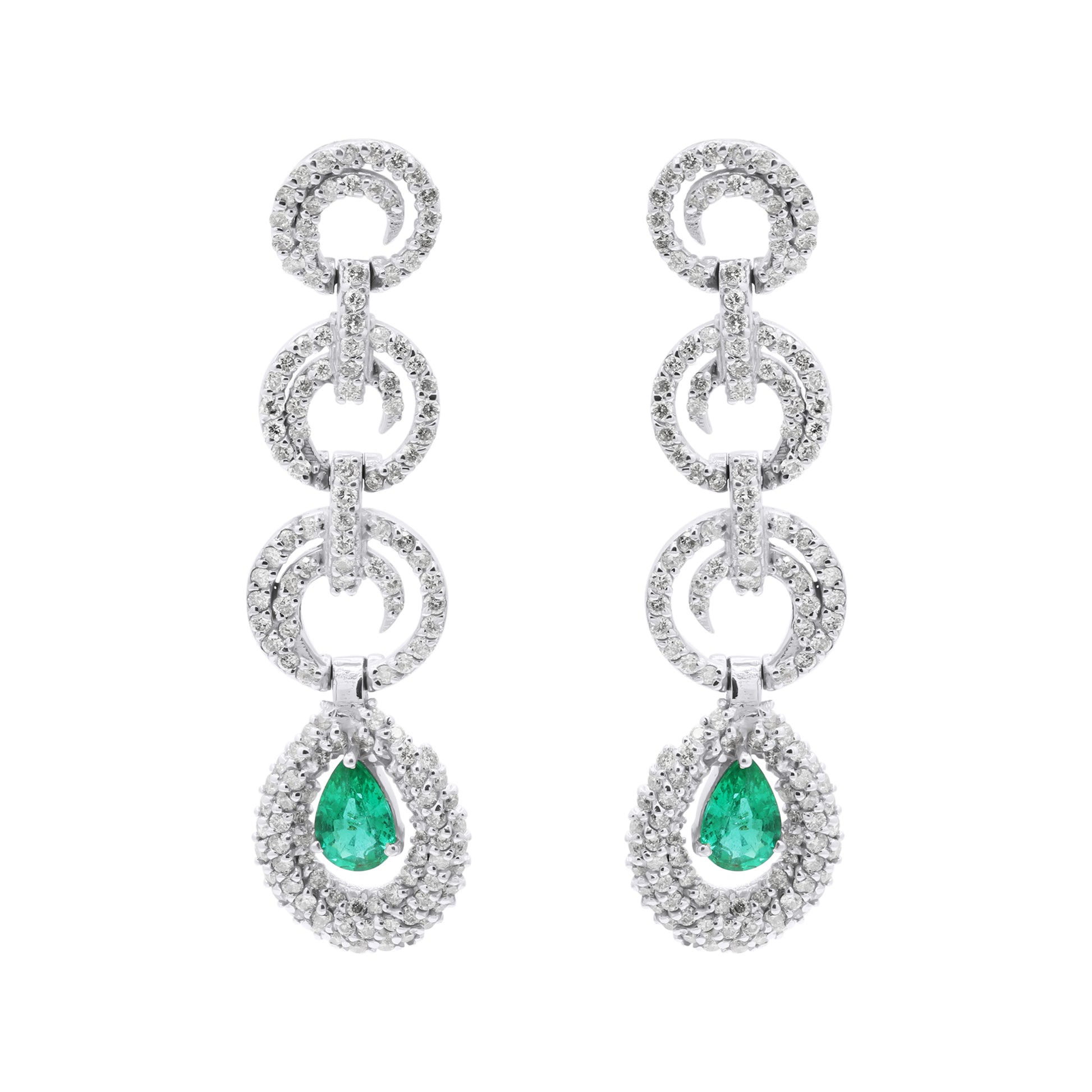 Pear Shaped Natural Emerald And Diamond Drop Dangle Earring In 18k White Gold