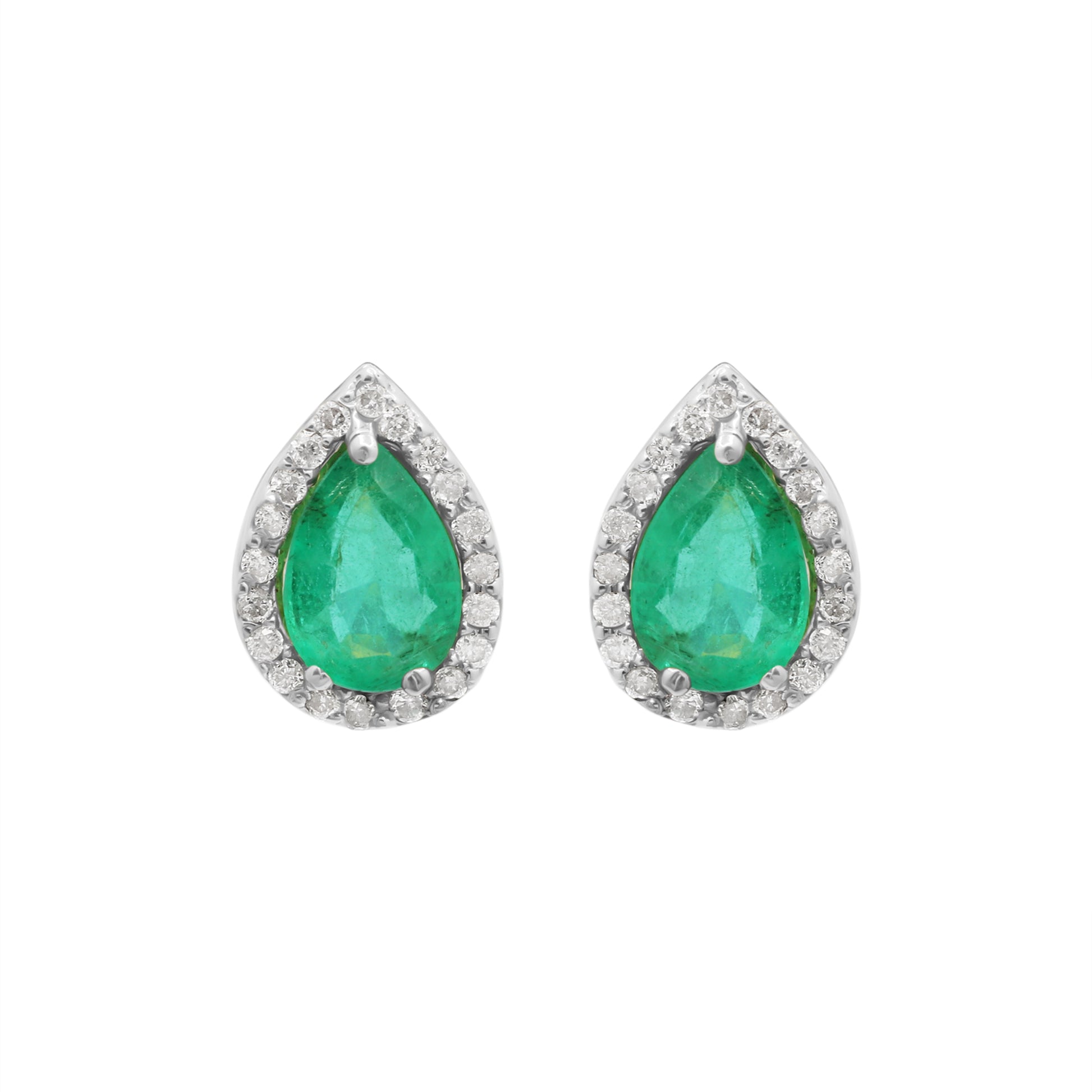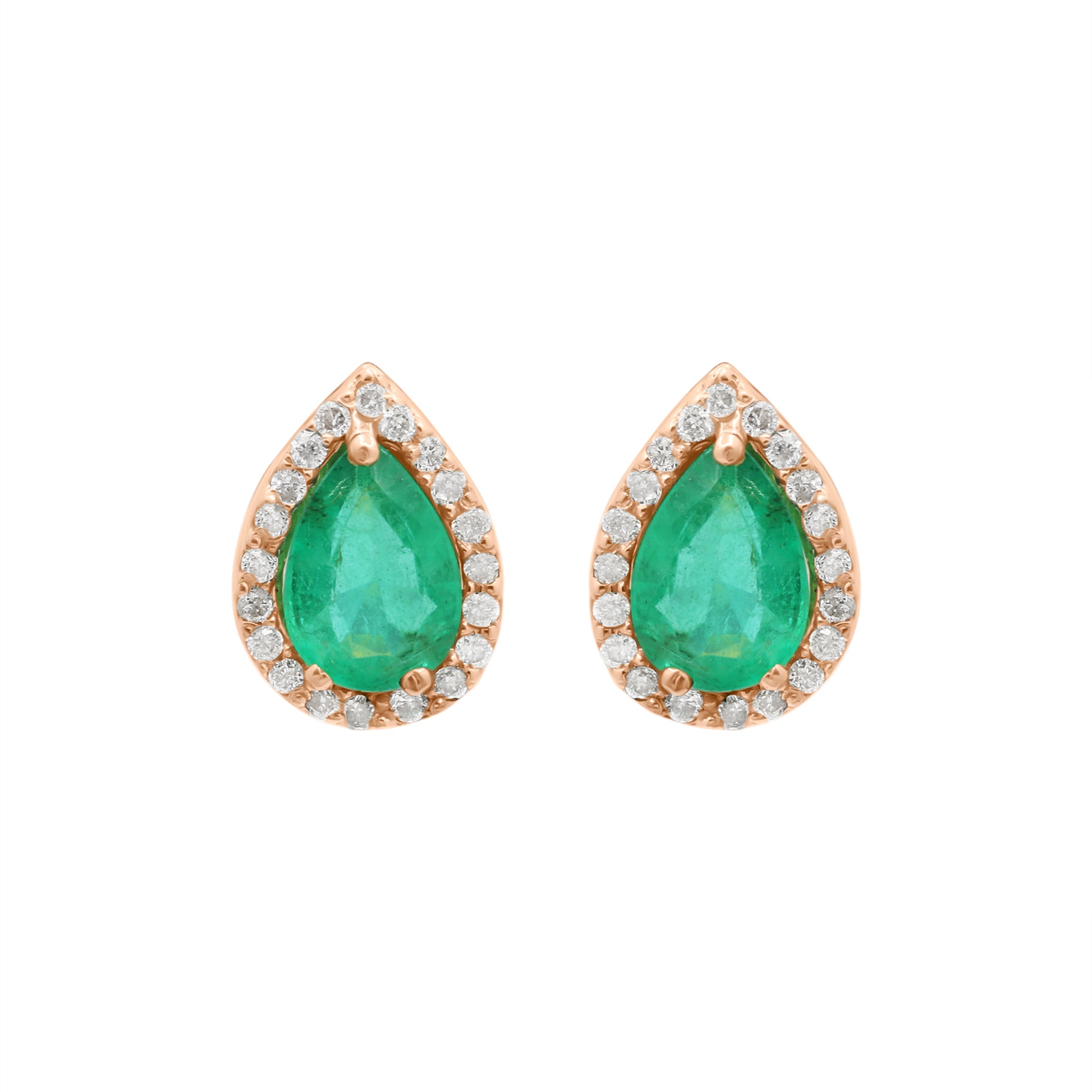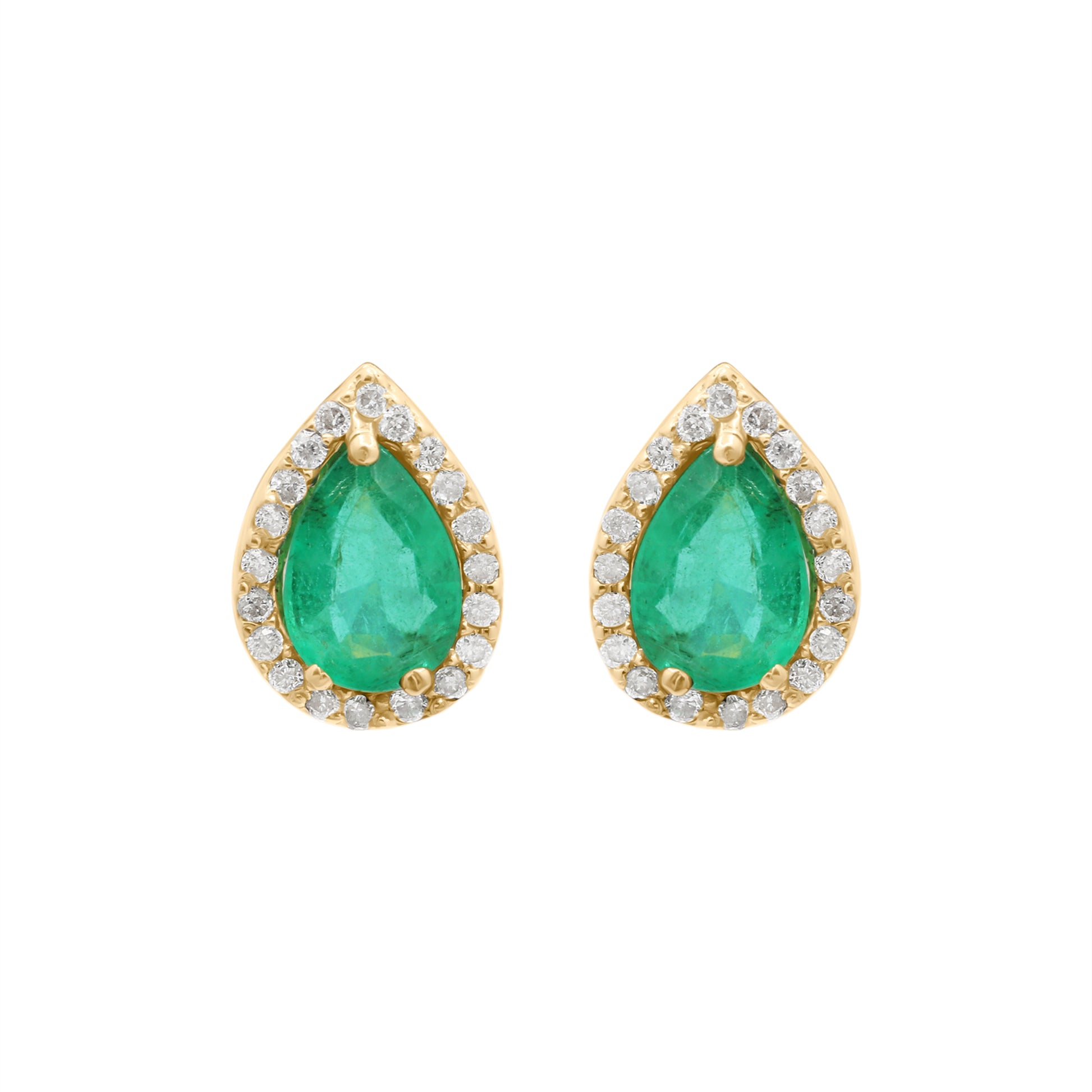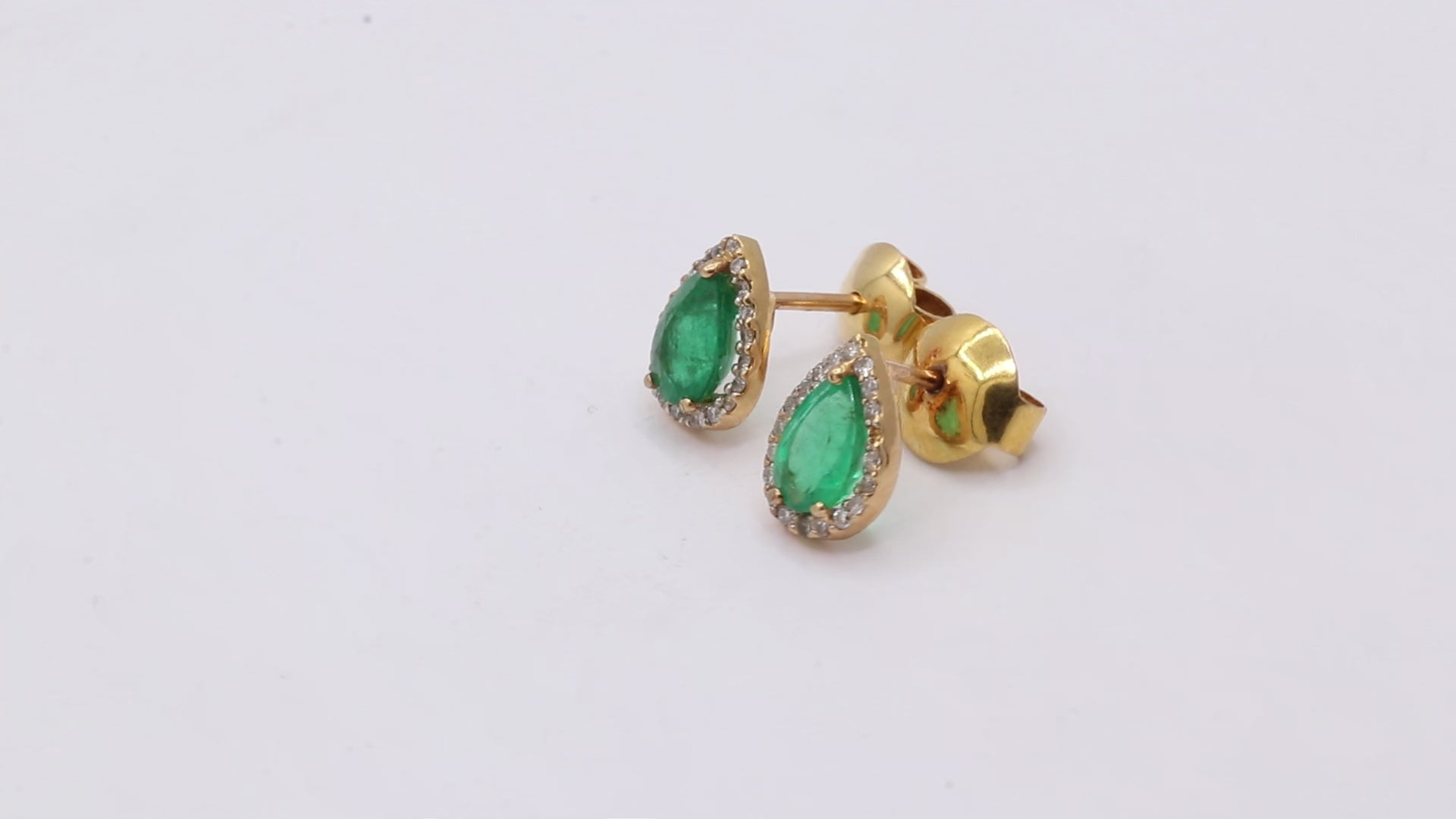 Pear Shaped Natural Emerald And Diamond Stud Earrings In 18k Yellow Gold