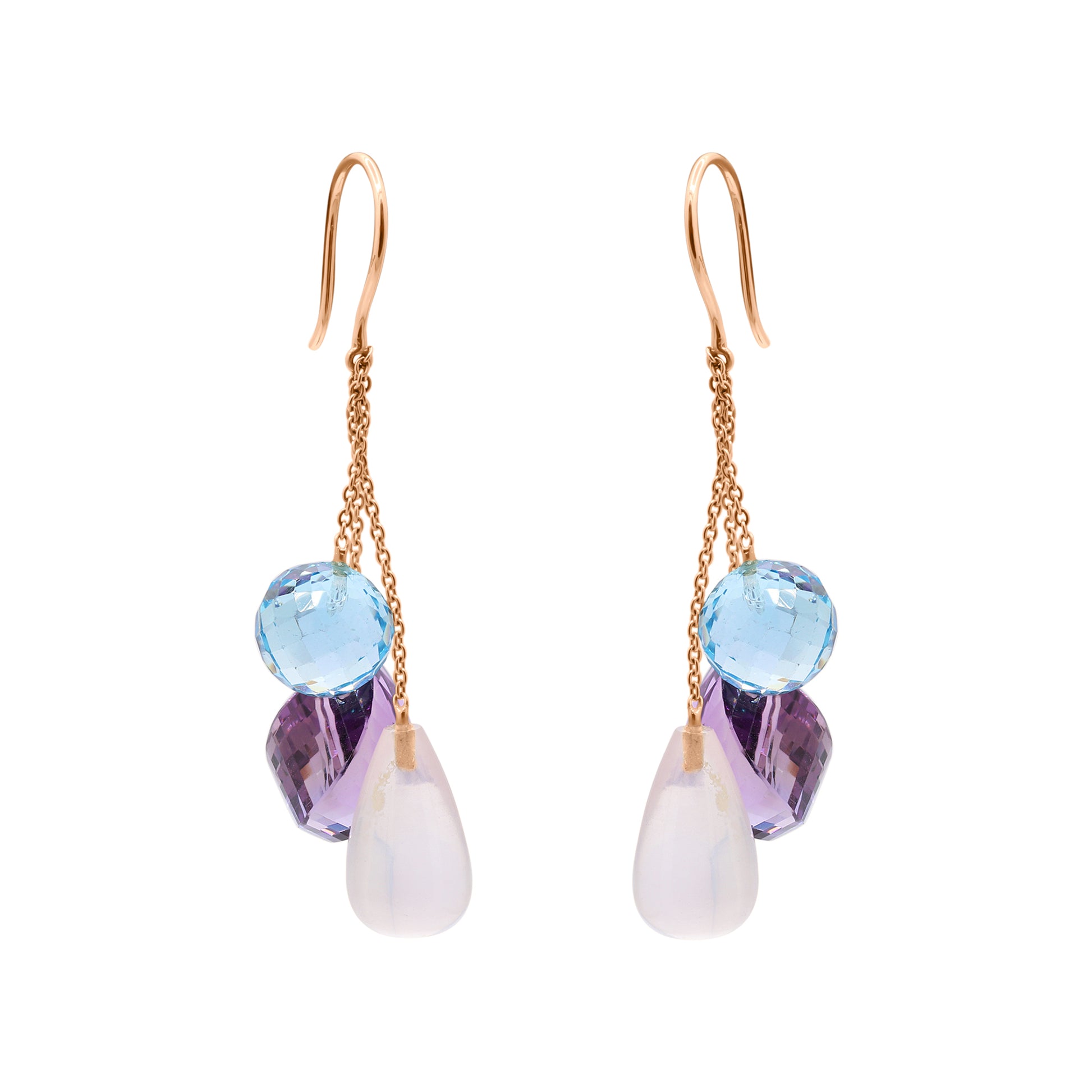 Natural Rose Quartz, Blue Topaz And Amethyst Gemstone Drop Earring In 18k Gold